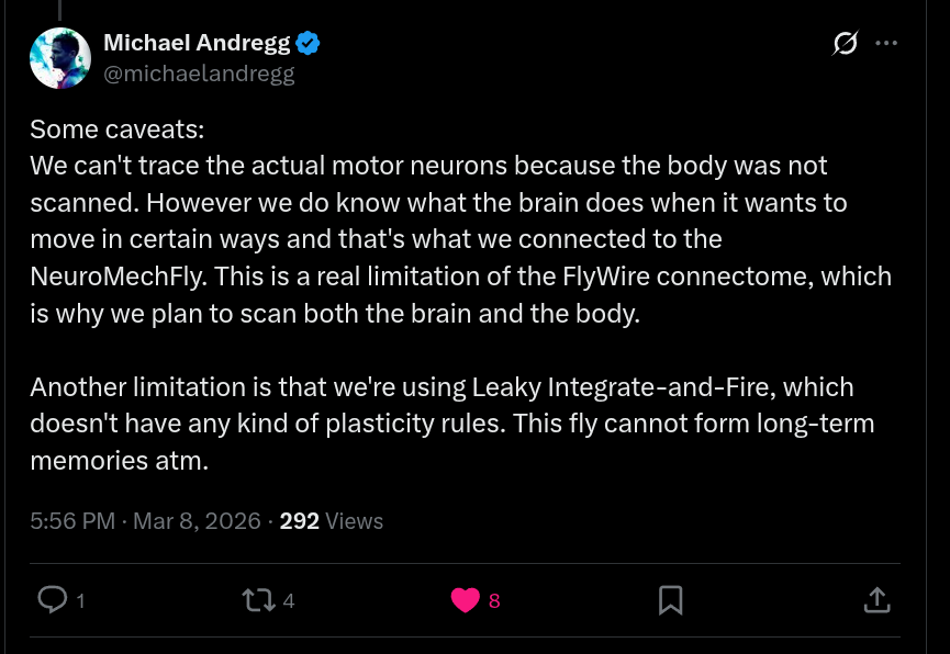 Conditional on sufficient detail being released Dec 31, 2026, will experts judge that the walking in Eon’s fly demo matches the straightforward non-expert interpretation of the post: that the connectome-based brain model, given biologically plausible sensory input, was itself doing most of the causal work producing legged locomotion, rather than an external gait controller or substantial hand-engineered motor scaffold?